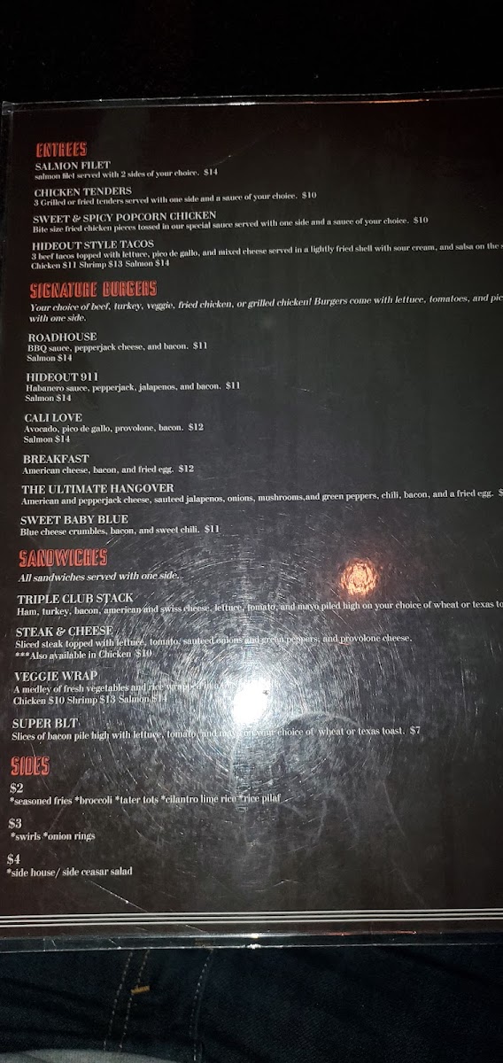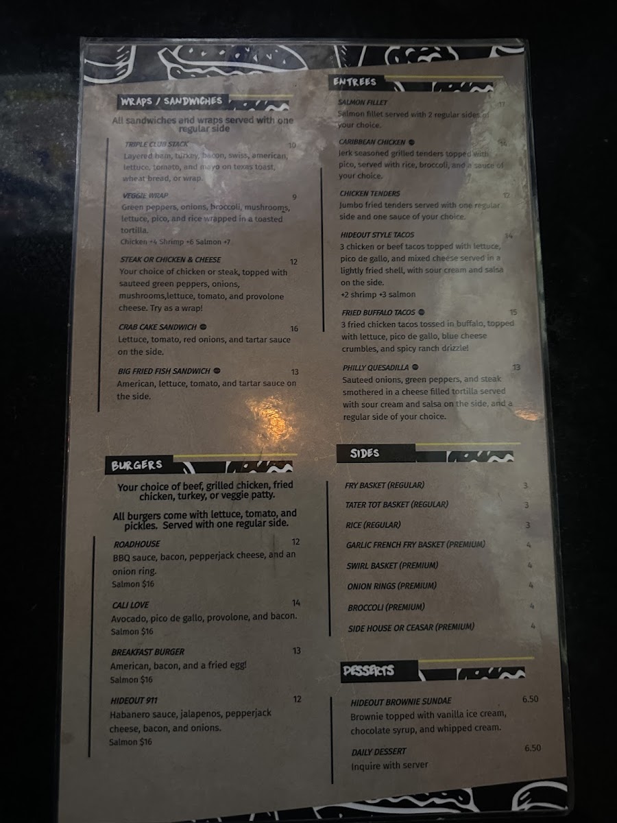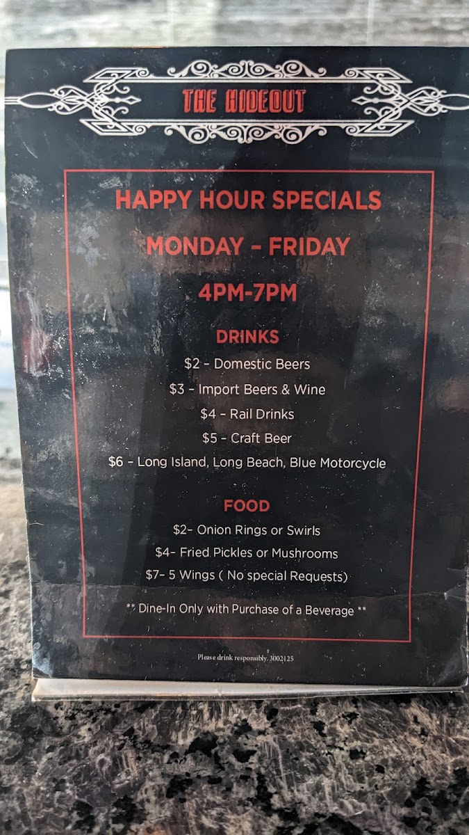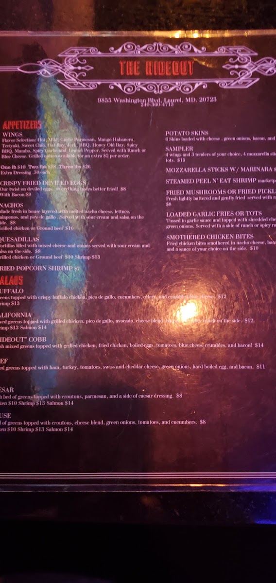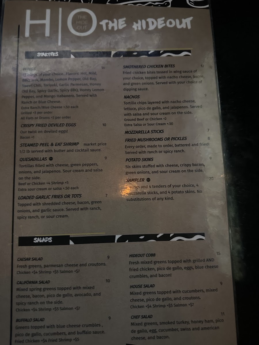 Introducing the menu at The Hideout - Laurel, a cozy gem located at 9855 Washington Blvd N, Laurel, MD, where comfort meets flavor. The vibrant atmosphere is perfect for catching a game, playing pool, or enjoying a night out with friends. The appetizer selection is a highlight, featuring Crispy Fried Deviled Eggs, Nachos, and Potato Skins that are sure to please. You can’t miss the Fried Chicken Wings, celebrated for their perfect seasoning, as noted by patrons like Just Ruth and Torae E.